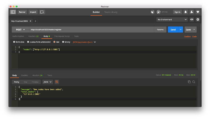 At this point you can grab a different machine if you like, and spin up different nodes on your network. Or spin up processes using different ports on the same machine. I spun up another node on my machine, on a different port, and registered it with my current node. Thus, I have two nodes: http://localhost:5000 and http://localhost:5001.