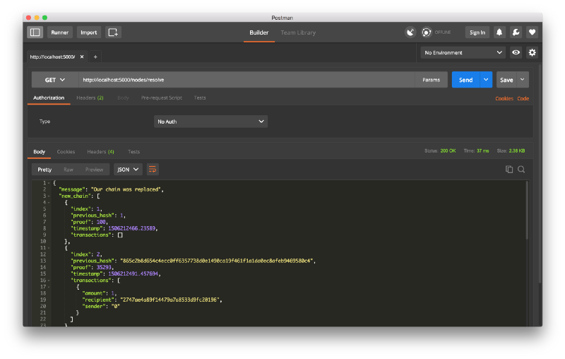 I then mined some new Blocks on node 2, to ensure the chain was longer. Afterward, I called GET /nodes/resolve on node 1, where the chain was replaced by the Consensus Algorithm: