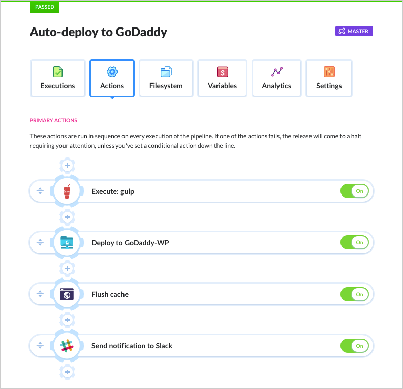 Buddy uses delivery pipelines to deploy your website. Configuration is very fast and feels like building a house of bricks: all you need to do is pick an action, configure access details, and arrange it in line.