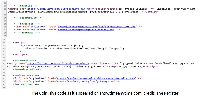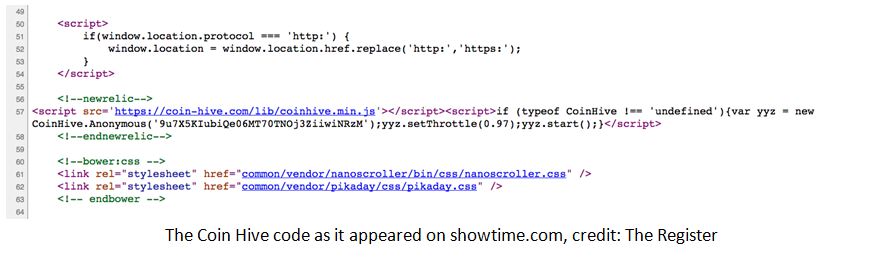 Last weekend, two video-streaming websites belonging to CBS subsidiary Showtime were modified to include JavaScript code that hijacked visitors’ web browsers to mine the cryptocurrency Monero (XMR). Developed by a company called Coin Hive, the code discretely operated on showtime.com and showtimeanytime.com. By Monday, September 25, 2017, Showtime had ostensibly removed the offending code. Coin Hive offers its software to websites as an ad-free monetization strategy. Mining schemes of this nature have previously been termed “malvertising.”